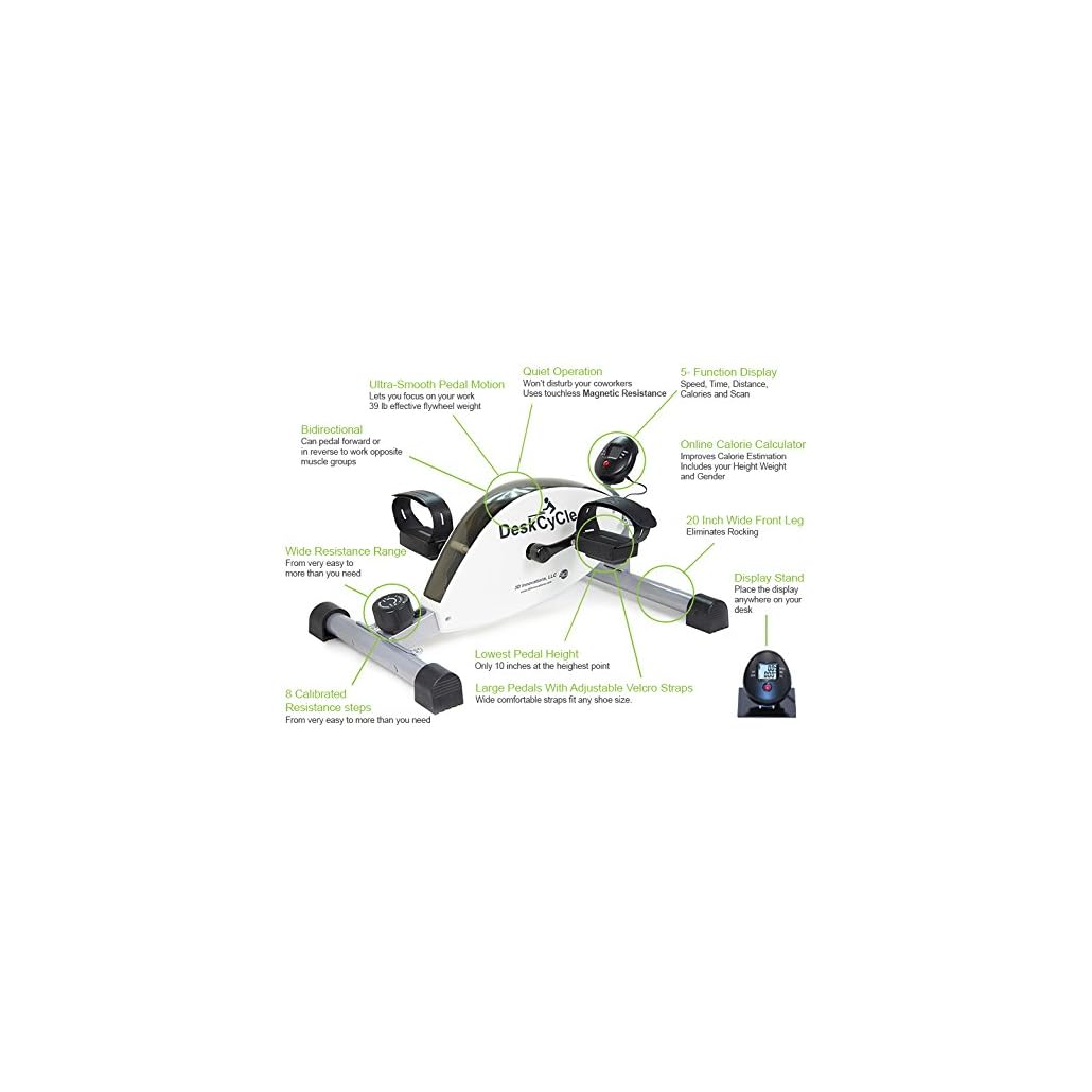 If you want to burn calories, improve your health, mood and productivity while typing at your desk, then the DeskCycle is the bike for you. The DeskCycle was specifically designed to be used in the work environment. It has the same patented magnetic resistance mechanism as in the MagneTrainer. This insures smooth and quiet operation. Smooth pedal motion is healthy for your joints and won’t distract you from your work. Quiet operation insures that you won’t disturb your coworkers. Other bikes use friction resistance which is not smooth and can be noisy. The DeskCycle has a lower profile than the MagneTrainer. The pedals are 5 inches lower than the MagneTrainer so that it will fit under desks better. It could be used at a 27 inch desk by a person as tall as 5’7″. At this height you will need to push the cycle further under your desk and extend your legs. You may also need to lower your chair. If you are taller, you will need a taller desk. The highest resistance level is twice as high as the highest resistance setting of the Magneciser, and MagneCycle. At the lowest level it takes no effort to pedal it. The pedal motion is bidirectional, which means you can pedal it forward as well as in reverse. This lets you work opposite muscle groups. It comes with the Large pedals with adjustable Velcro straps. It has 8 calibrated resistance levels. We also provide an online calorie calculator on the desk-cycle website.