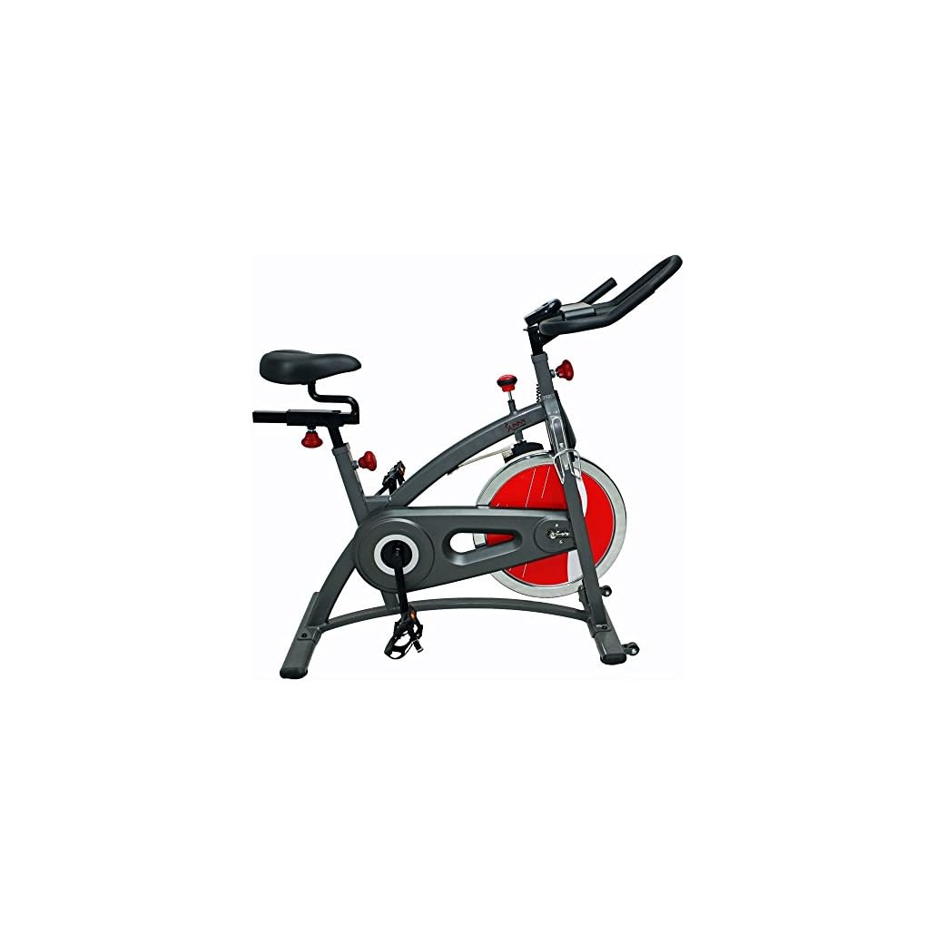 A good cardio workout in controlled conditions is hard to come by, but when the Sunny Health & Fitness SF-B1423 Belt Drive Indoor Cycling Bike is how you get a good sweat going, you can take it almost anywhere you want. This versatile bike is customizable to your needs, from the seat and handlebars to the lever of resistance coming from the belt-driven flywheel. It’s a great way to squeeze in a cardio workout anywhere, anytime. Additional Features: Steel frame with powder-coat finish Cushioned saddle adjusts in 2 directions Displays time, distance, speed, and calories burned Cage-style pedals Bottle holder Transport wheels Weight capacity: 250 lbs. About Sunny Health & Fitness Sunny Health & Fitness has been importing and distributing high-quality health and fitness products for over ten years. From their headquarters in Los Angeles, California, they import equipment from direct sources in Taiwan and China to provide more competitive pricing than the average health and fitness equipment distributor. Because they are committed to excellence and stand behind the quality of every one of their products, Sunny Health & Fitness has become one of the fastest-growing companies in the market. Belt-driven, 40-lb. chrome flywheel. Fully adjustable seat and handlebars. Informative LCD display. Adjustable resistance with press-down braking. Smooth, quiet operation. Dimensions: 47L x 20W x 44H in..
